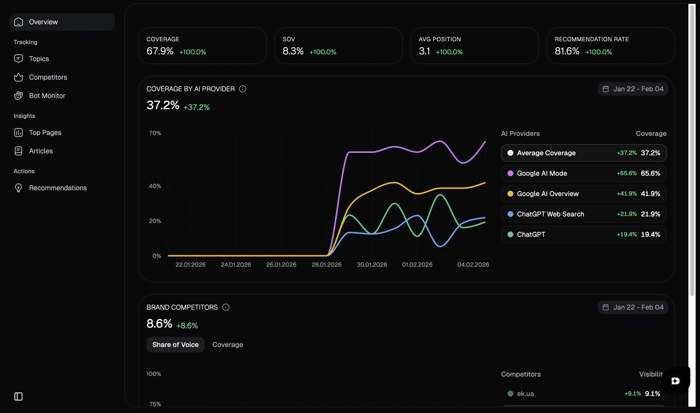The first Smart Recommendations are typically available in about ~10 days after tracking starts, once baseline data collection and competitor benchmarking are complete. After that, results depend on how quickly improvements are implemented.